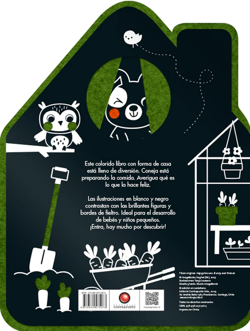 Oso celebra su cumpleaños y Coneja está preparando mermelada de zanahorias. Cda uno está en su propia casa, aunque algo tengan en común: ¡son felices al compartir con sus amigos!