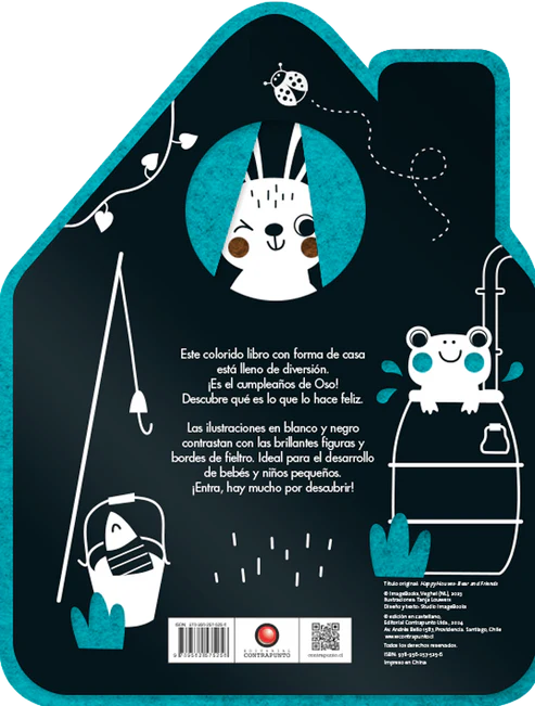 Oso celebra su cumpleaños y Coneja está preparando mermelada de zanahorias. Cda uno está en su propia casa, aunque algo tengan en común: ¡son felices al compartir con sus amigos!