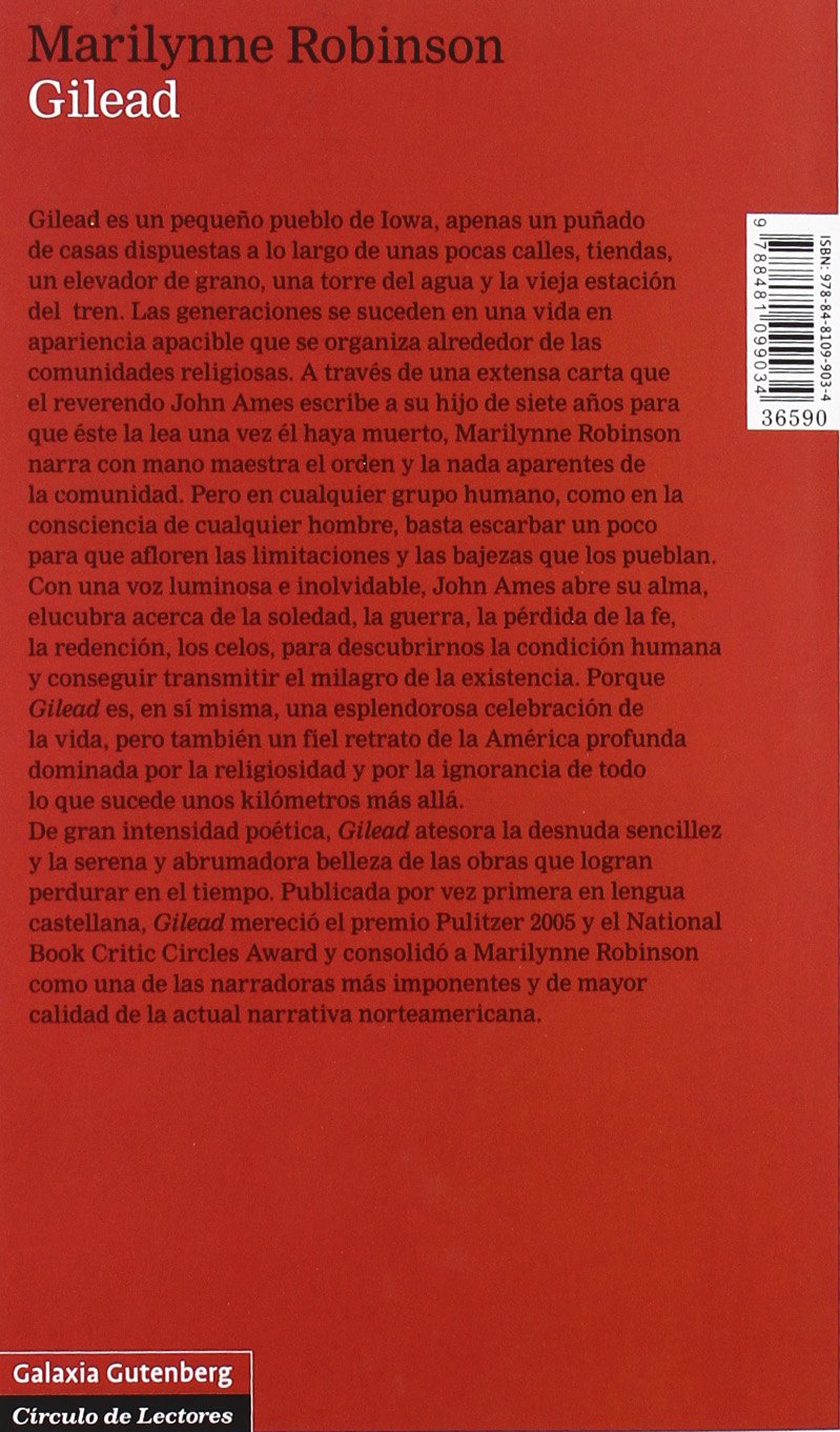 Gilead es un pequeño pueblo de Iowa, apenas un puñado de casas dispuestas a lo largo de unas pocas calles, tiendas, un elevador de grano, una torre del agua y la vieja estación del tren. Las generaciones se suceden en una vida en apariencia apacible que se organiza alrededor de las comunidades religiosas. A través de una extensa carta que el reverendo John Ames escribe a su hijo de siete años para que éste la lea una vez él haya muerto, Marilynne Robinson narra con mano maestra el orden y la nada aparentes de la comunidad. Pero en cualquier grupo humano, como en la consciencia de cualquier hombre, basta escarbar un poco para que afloren las limitaciones y las bajezas que los pueblan. Con una voz luminosa e inolvidable, John Ames abre su alma, elucubra acerca de la soledad, la guerra, la pérdida de la fe, la redención, los celos, para descubrirnos la condición humana y conseguir transmitir el milagro de la existencia. Porque Gilead es, en sí misma, una esplendorosa celebración de la vida, pero también un fiel retrato de la América profunda dominada por la religiosidad y por la ignorancia de todo lo que sucede unos kilómetros más allá. De gran intensidad poética, Gilead atesora la desnuda sencillez y la serena y abrumadora belleza de las obras que logran perdurar en el tiempo. Publicada por vez primera en lengua castellana, Gilead mereció el premio Pulitzer 2005 y el National Book Critic Circles Award y consolidó a Marilynne Robinson como una de las narradoras más imponentes y de mayor calidad de la actual narrativa norteamericana.