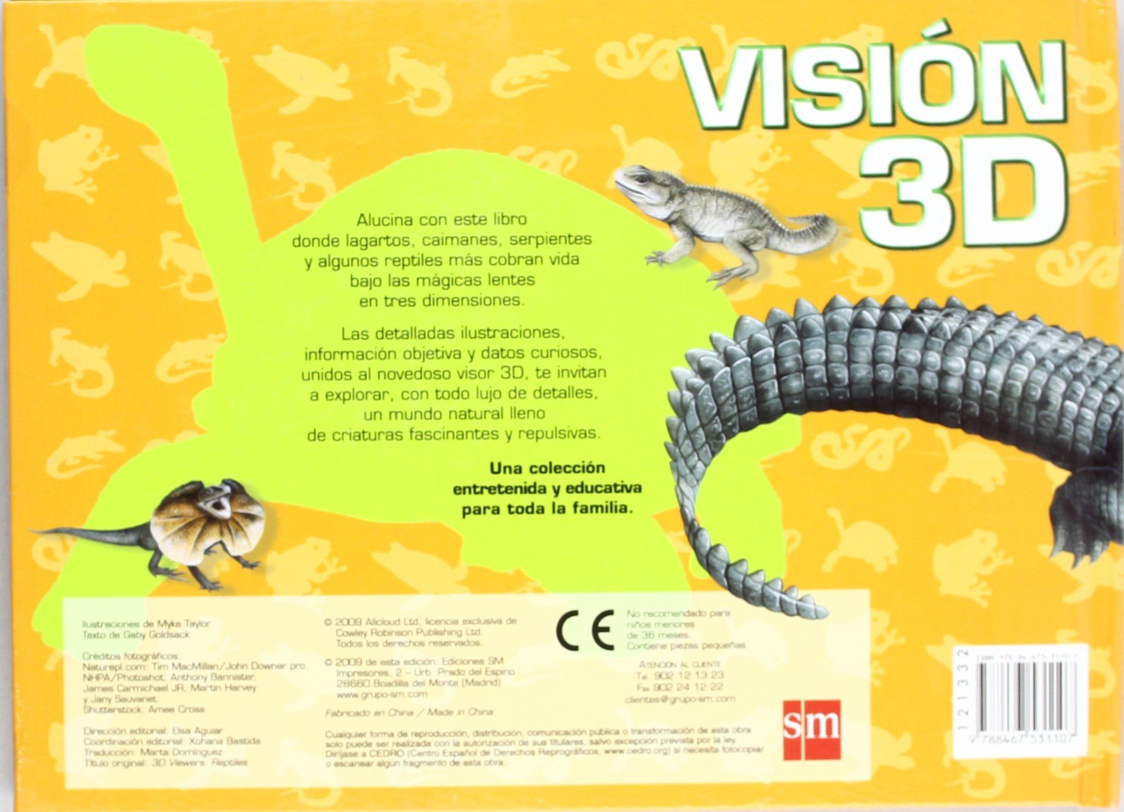 Alucina con este libro donde lagartos, caimanes, serpientes y algunos reptiles más cobran vida bajo las mágicas lentes en tres dimensiones. Las detalladas ilustraciones, información objetiva y datos curiosos, unidos al novedoso visor 3D, te invitan a explorar, con todo lujo de detalle, un mundo natural lleno de criaturas fascinantes y asquerosas. Una colección entretenida y educativa para toda la familia.