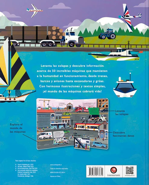 Más de mil aviones despegan cada día de los aeropuertos más activos del mundo, así como también variados tipos de máquinas ayudan a que todo funcione correctamente en cada uno de estos terminales aéreos. Mientras tanto, en otro lugar de la ciudad, una obra de construcción está repleta de máquinas que hacen mucho ruido mientras cavan, perforan y mueven la tierra. Asimismo, como la mayor parte de la tierra está cubierta de agua, las embarcaciones marítimas han sido utilizadas como medio de transporte durante miles de años. ¿Lo sabías? Este libro te invita a levantar las solapas y descubrir muchísimos datos acerca de 50 increíbles máquinas que mantienen a la humanidad en funcionamiento: desde trenes, barcos y aviones hasta excavadoras y grúas. Incluye hermosas ilustraciones, textos cortos y de muy fácil lectura.